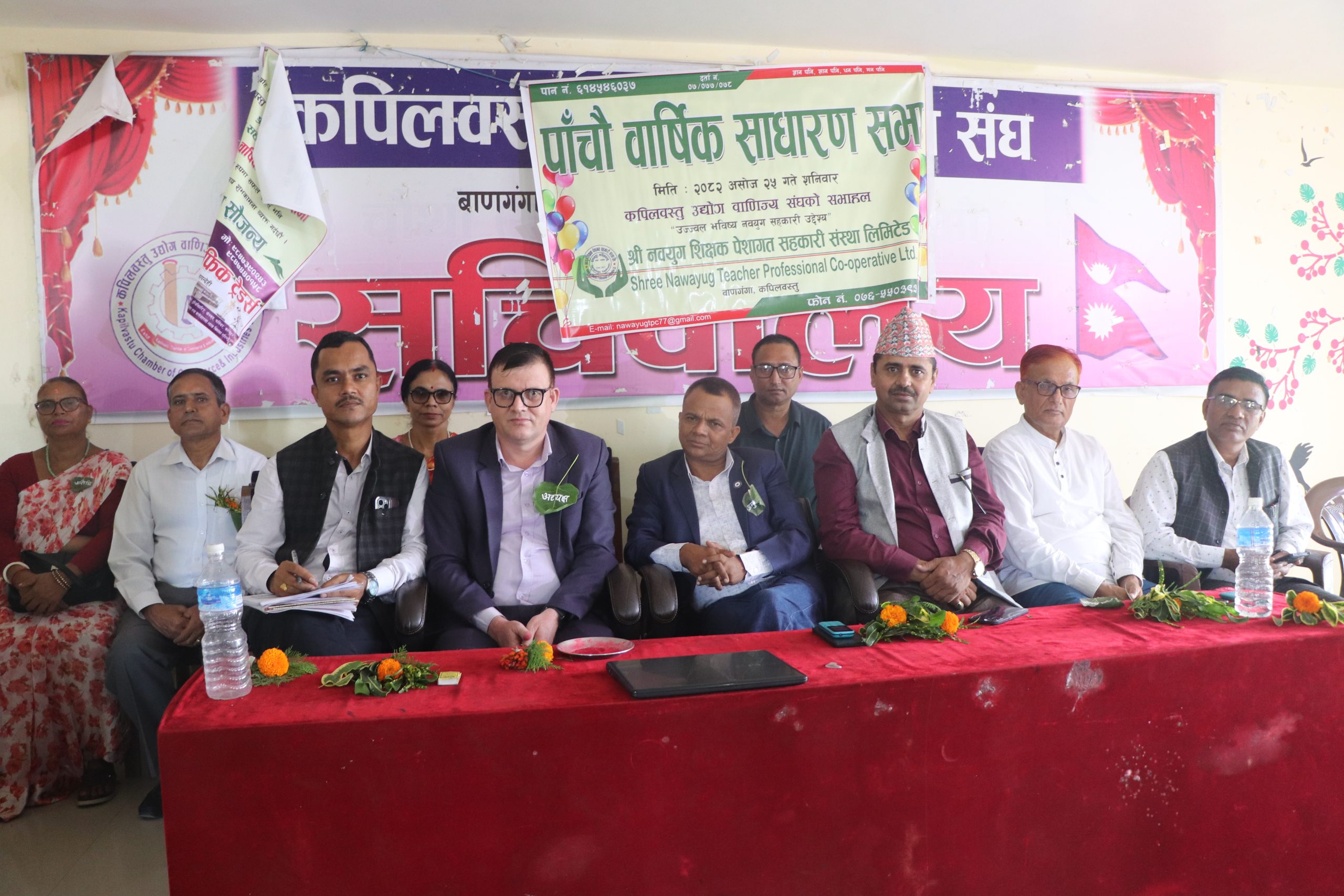 चेतन विष्ट, कपिलवस्तु । नवयुग शिक्षक पेसागत सहकारी संस्था लिमिटेडको पाँचौ वार्षिक साधारणसभा सम्पन्न भएको छ । उक्त कार्यक्रम शनिबार कपिलवस्तु उद्योग बाणिज्य संघको