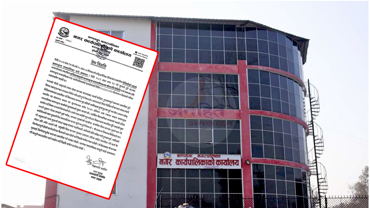 ‘मिति २०८१ माघ २३ गते वर्ष २५ अंक ५३ मेचिकाली राष्ट्रिय दैनिक पत्रिकाबाट प्रकाशित बेथितीको अड्डा बाणगङ्गा नगरपालिका भन्ने समाचार र मिति २०८१ साल माघ २३ गते बुटवल टुडे डट कम.अनलाईनबाट प्रकाशित कपिलवस्तुको बाणगङ्गा नगरपालिकामा मौलाउँदै बेथिति भन्ने समाचार प्रति बाणगङ्गा नगरपालिका नगर कार्यपालिकाको कार्यालयको मिति २०८१/१०/२३ गते सम्पन्न बैठकको गम्भिर ध्यानाकर्षण भएको छ । राज्यको चौथो अङ्गको रुपमा रहेका सञ्चार माध्यमबाट स्वार्थ केन्द्रित, दुरासायपूर्ण समाचार प्रकाशित हुने विषय स्वयम् सञ्चार जगतका निम्ति पनि क्षति पुग्ने विषय हो । समाजलाई दिशा निर्दिष्ट गर्ने सञ्चार जगत स्वार्थ केन्द्रित समाचार प्रकाशित गर्ने विषयबाट सञ्चार गृह प्रतिको जनविश्वास गुम्ने कुरामा दुई मत छैन । स्मरण रहोस् स्थानीय तह संस्थागत क्षमता स्वः मूल्यांकनमा समेत ९४.७५ प्रतिशत अंक ल्याउन सफल बाणगङ्गा नगरपालिका बाणगङ्गा बासीको सुशासनको मुख्य आधार हो । आर्थिक मितव्ययिता जनताको करको उचित उपयोग गर्ने विषय नगरको जिम्मेवारी हो । हामी स्पष्ट पार्दछौं न्यून दररेटमा विज्ञापनहरु प्रकाशित हुँदै आएको कुरा नगरले भुक्तान गरेका तथ्यले पुष्टी गर्दछ । सञ्चार गृहसंगको सम्झौता, कार्यादेश बिना सञ्चार गृहले माग गरे बमोजिमको रकम भुक्तानी दिन नगरपालिका बाध्य नहुने कानूनी विषय हो । यी सामान्य विषयमा मिडियाले माग गरे अनुसारको रकम भुक्तानी नपाए पश्चात् नगरका पदाधिकारी, कर्मचारी प्रति लक्षित गरी दुरासयपूर्ण, व्यक्तिको जीवन प्रति आँच आउने गरी अनुमति विना सञ्चार गृहबाट समाचार तस्विर सहित प्रकाशित गर्ने कार्य गैर जिम्मेवारपूर्ण रहेको कार्यपालिका बैठकको ठहर रहेको यसै विज्ञप्ती मार्फत स्पष्ट पार्दछौं र यो बैठकबाट ती सञ्चार गृहलाई जिम्मेवारपूर्वक समाचार प्रकाशित गर्न आग्रह गर्दछौं। अन्यथा नगरपालिका कानूनी बाटो अवलम्बन गर्दै कानूनी कारवाहीमा जाने व्यहोरा यसै विज्ञप्ति मार्फत उल्लेख गर्दछौं,’ विज्ञप्तिमा उल्लेख गरिएको छ ।