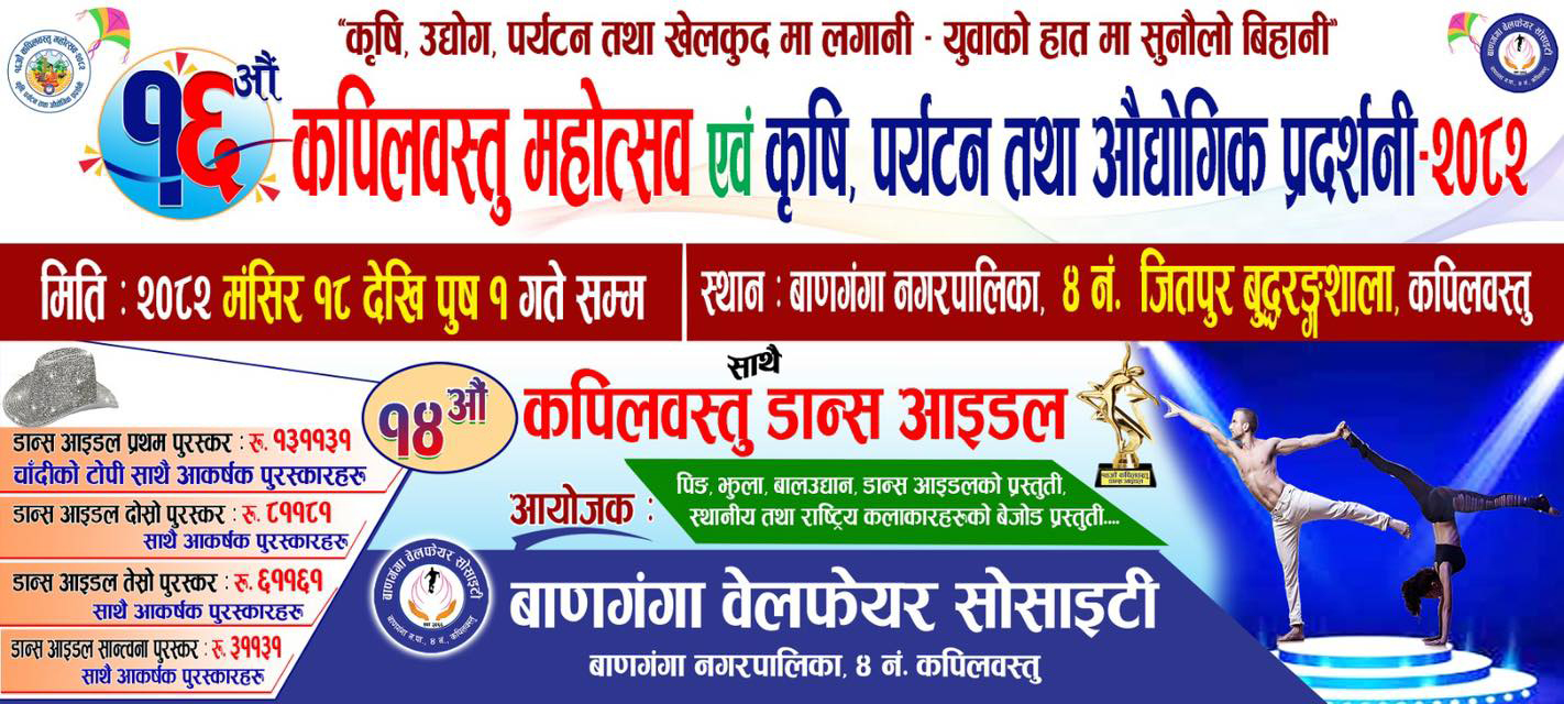 बाणगंगा । बाणगंगा वेलफेयर सोसाइटीको आयोजनामा यही मंसिर १८ गतेदेखि पुष १ गतेसम्म हुने १६ औँ कपिलवस्तु महोत्सवमा १४ औँ कपिलवस्तु डान्स आईडल हुने भएको छ ।
