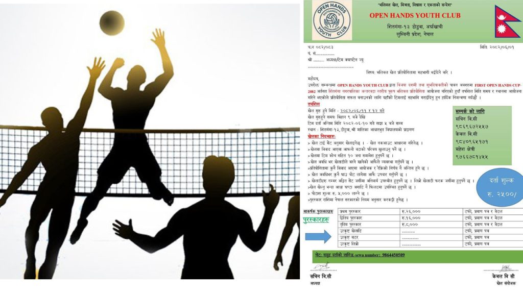 चेतन विष्ट, कपिलवस्तु । अर्घाखाँचीको शितगंगा नगरपालिका वडा नम्बर– १३ डोडुवामा भलिबल प्रतियोगित हुने भएको छ । ओप्पन ह्याण्डस युथ क्लबको आयोजनामा शितगंगा नगरपालिका अन्तर वडास्तरीय पुरुष भलिवल प्रतियोगिता असोज ११ र १२ गते हुन लागेको क्लबका अध्यक्ष सचिन क्षेत्रीले जनहित अनलाइन सङ्ग बताउनुभयो । प्रतियोगितमा प्रथम हुने समुहलाई २६ हजार सहित ट्रफी, मेडर र […]