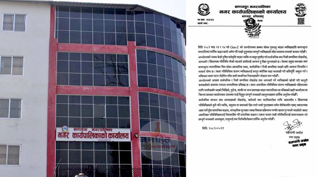 कपिलवस्तु । भदौ २३ र २४ गते भएको जेनजी आन्दोलनका क्रममा बाणगंगा नगरपालिकामा भएको आगजनी र तोडफोडका घटनाप्रति नगरपालिकाले गम्भीर ध्यानाकर्षण जनाएको छ। आन्दोलनकै नाममा सार्वजनिक र निजी सम्पत्तिमा भएको क्षतिको विरोध गर्दै नगर प्रमुख चक्रपाणि अर्यालले यस्तो गतिविधि नगरको शान्ति, सद्भाव र विकासलाई प्रत्यक्ष असर पार्ने बताएका छन् । नगरपालिकाद्वारा जारी विज्ञप्तिमा आन्दोलनका क्रममा […]
